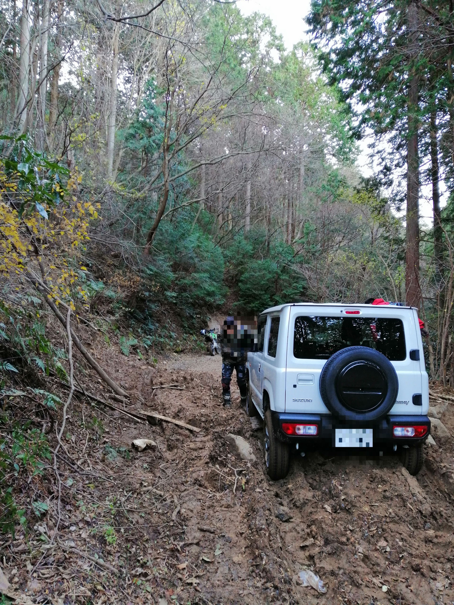 夕方前に林道へ出たところで、新型ジムニーが泥に嵌っていた。
